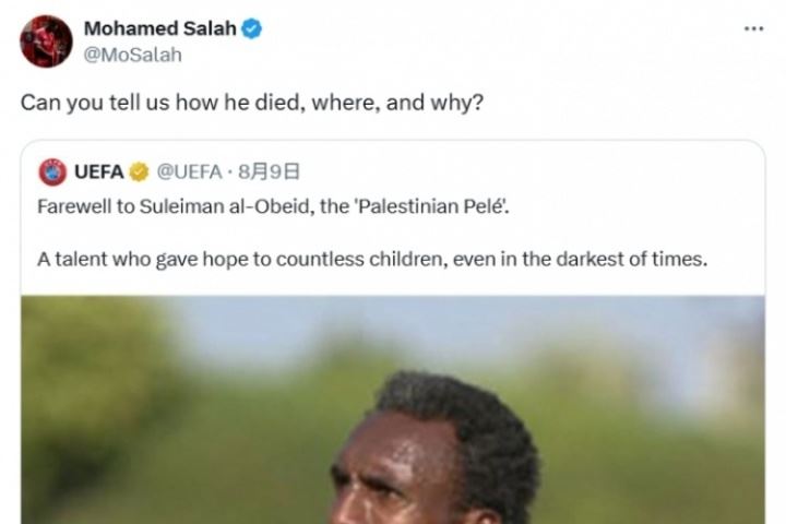 体育资讯08月10日讯 欧足联官方此前发文,向不幸丧生的巴勒斯坦球星奥贝德简短致哀。利物浦球星萨拉赫转发了这则帖文,并发出了三个疑问。