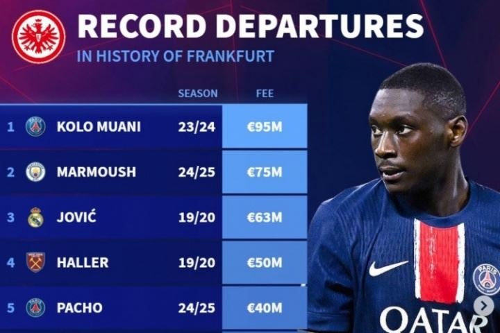 如果这笔转会按照目前的进展顺利完成,埃基蒂克有望成为法兰克福队史转出标王,超越9500万欧的穆阿尼。
