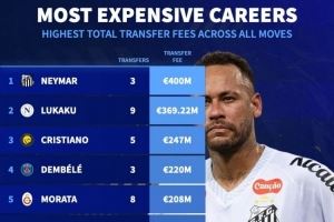 球员生涯总转会费排名:内马尔4亿欧居首,卢卡库、C罗二三位