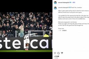 姆班古拉社媒告别尤文:效力5年后离队是艰难选择,但我需要成长
