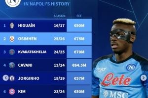 体育资讯7月31日讯 奥斯梅恩转会加拉塔萨雷只待官宣,《转会市场》也统计了那不勒斯队史最贵卖人情况,伊瓜因仍居首。