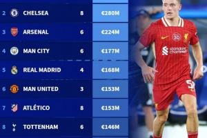 目前夏窗引援花费榜:利物浦签5人2.94亿欧居首,前四均来自英超